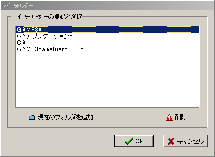例:appと入力して履歴機能を使った場合、appという名前が入った履歴内の該当フォルダが一覧表示されます。マイフォルダー ユーザーが登録したフォルダを呼び出すことが出来ます。 OK 入力されたフォルダを確定します。 キャンセル フォルダ入力を中止して処理をキャンセルします。